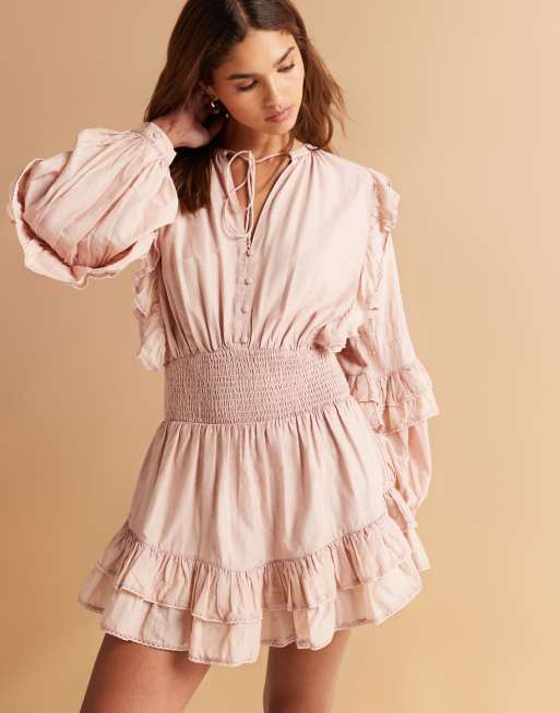 ASOS DESIGN – Rosa, tvättad miniklänning med smockad midja och volangfåll