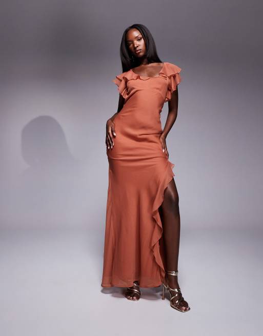 ASOS DESIGN – Rostfärgad maxiklänning med volang, utsvängd ärm och sidoslits