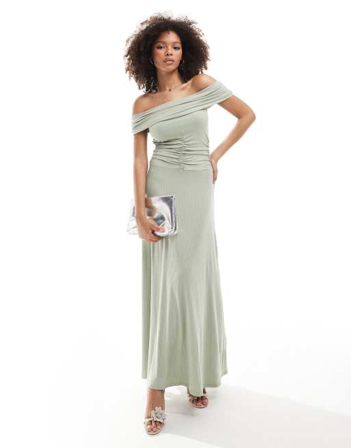 ASOS DESIGN – Salviagrön maxiklänning med bardotringning och rysch