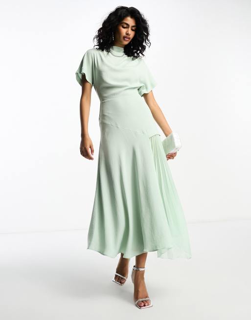 ASOS DESIGN – Salviagrön midiklänning med draperad ringning och asymmetrisk, veckad fåll