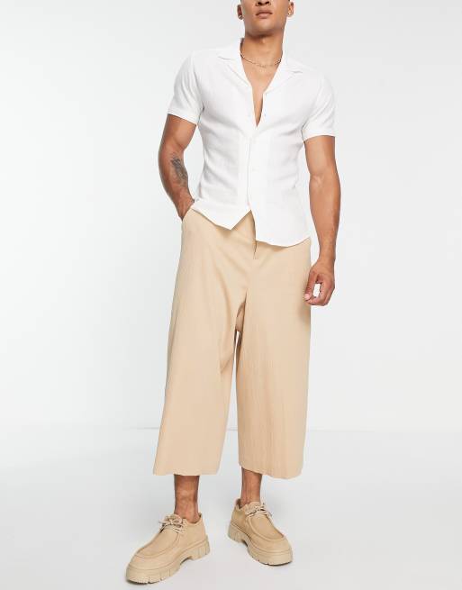 ASOS DESIGN – Sandfärgade krinklade finbyxor i culotte-modell med extremt vida ben