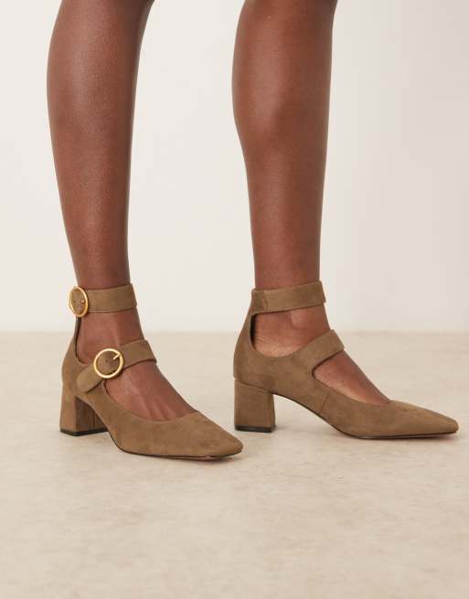 ASOS DESIGN – Sasha – Olivgröna skor med halvhöga blockklackar och två spännen i mockaimitation