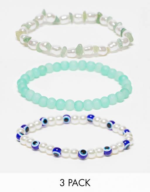 ASOS DESIGN – Set med blått och grönt armband med pärlimitationer och onda ögat, 3-pack