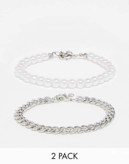 ASOS DESIGN – Silverfärgat armband med kedja och pärlor på 6mm, 2-pack
