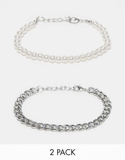 ASOS DESIGN – Silverfärgat armband med kedja och pärlor på 6mm, 2-pack