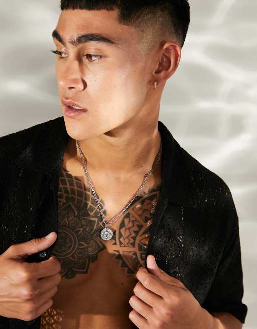 ASOS DESIGN – Silverfärgat halsband med runt, aztec-mönstrat kompasshänge i präglat, rostfritt stål