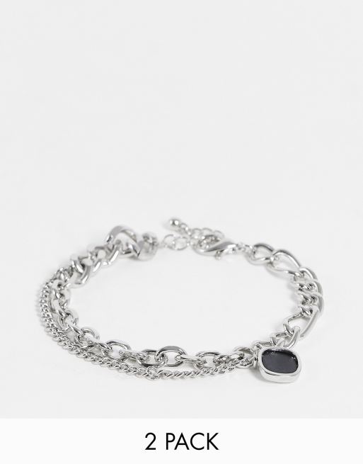 ASOS DESIGN – Silverfärgat kedjearmband i set med svart agatstenshänge, 2-pack