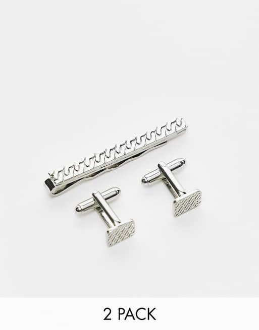 ASOS DESIGN – Silverfärgat set med manschetter och slipsnål med präglade detaljer, 2-pack