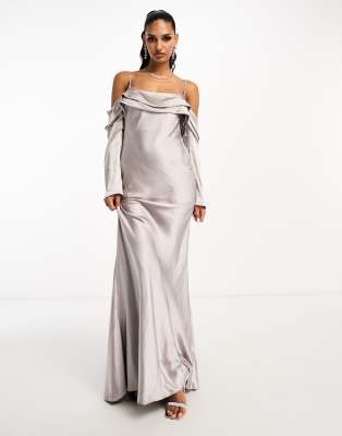 ASOS DESIGN – Silvergrå maxiklänning i satin med off shoulder-design