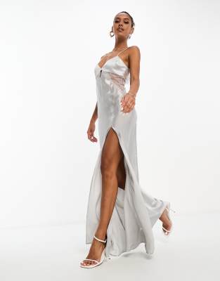 ASOS DESIGN – Silvergrå maxiklänning i satin med spetsinslag och nyckelhålsöppning