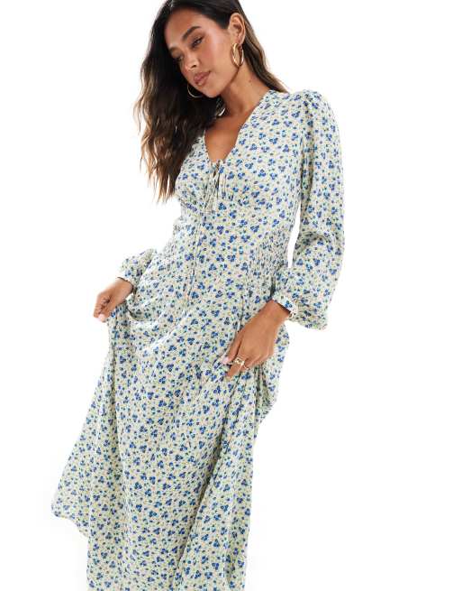 ASOS DESIGN – Småblommig midiklänning med v-ringning, långa ärmar och knytning framtill av viskos