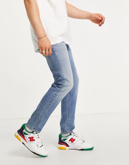 ASOS DESIGN – Smala jeans med stretch och slitna detaljer i mellanljus tvätt