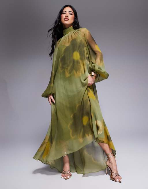 ASOS DESIGN – Smockklänning i maxilängd med knytning vid halsen, ojämn fåll och suddigt blomtryck