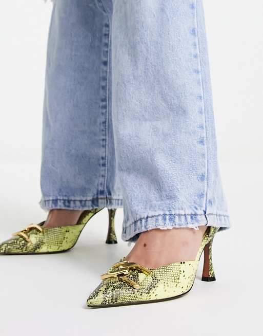 ASOS DESIGN – Sommers – Limegröna, ormskinnsmönstrade, halvhöga klackskor med kedjedetalj