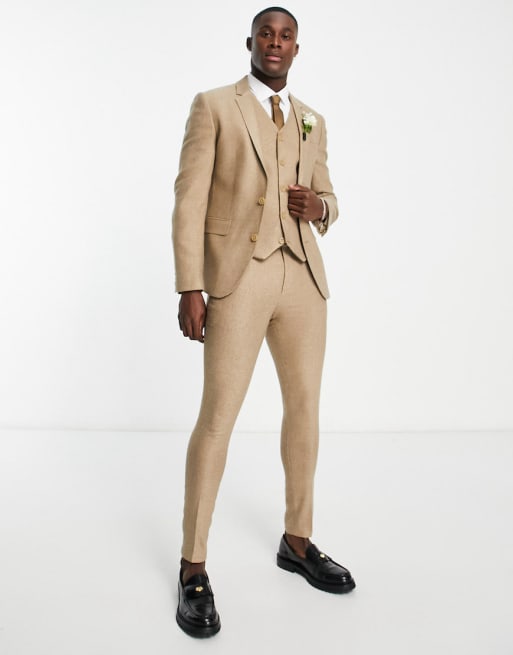 ASOS DESIGN – Stenfärgad fiskbensmönstrad kostym i yllemix med supersmal passform