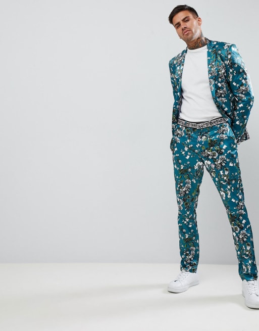 ASOS DESIGN – Superskinny tealfärgad kostym i blommig satin