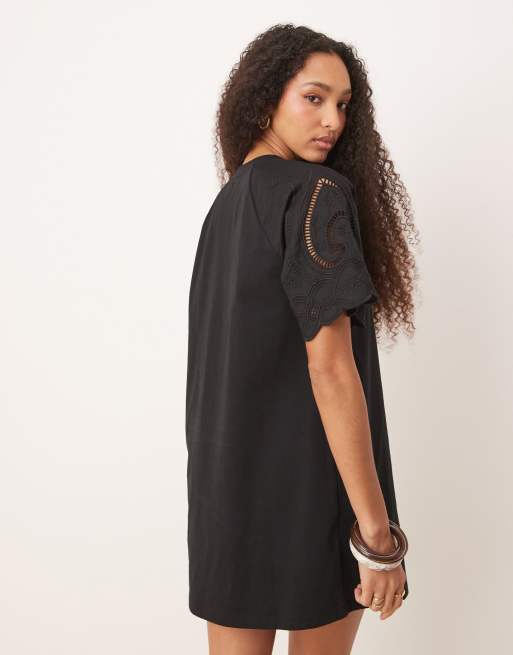 ASOS DESIGN – Svar t-shirtklänning med virkad spets på ärmarna