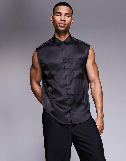 ASOS DESIGN – Svart, ärmlös skjorta i satin och regular fit