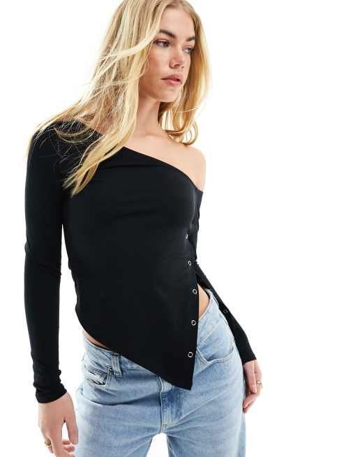 ASOS DESIGN – Svart, asymmetrisk långärmad topp med tryckknappar i sidan