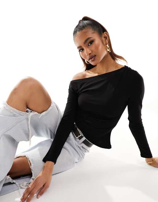 ASOS DESIGN – Svart, asymmetrisk topp med bara axlar och drapering