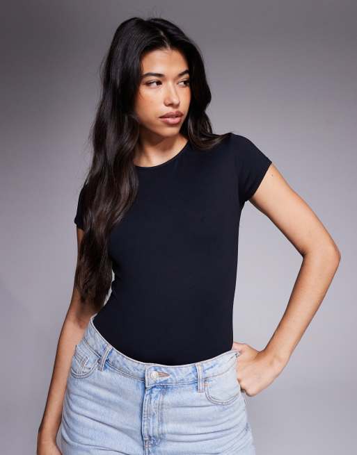 ASOS DESIGN – Svart, åtsmitande body i polyamid med korta ärmar