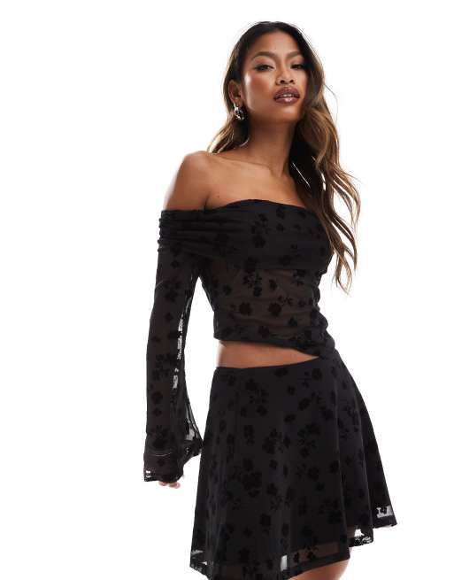 ASOS DESIGN – Svart, blommig topp i devoré med bardotringning, del av set