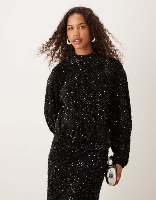 ASOS DESIGN – Svart blus med långa ärmar, öppen rygg och paljetter i sammet, del av set