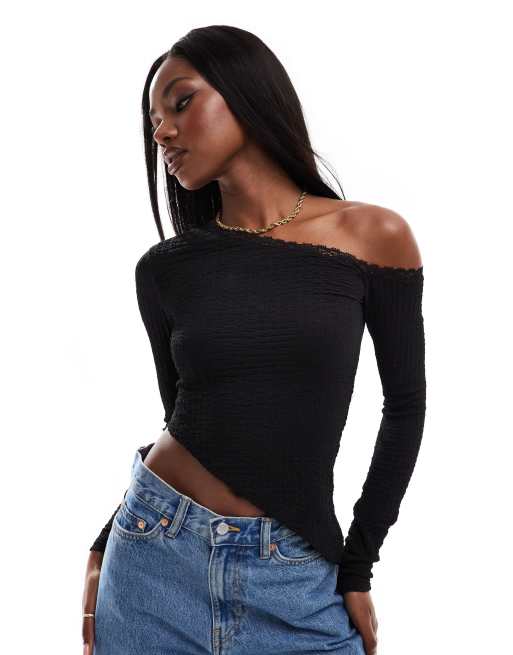 ASOS DESIGN – Svart, enaxlad topp med textur och spets