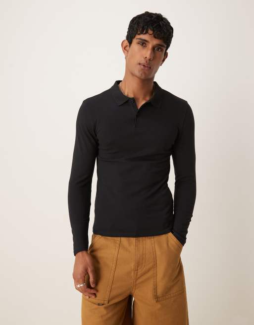 ASOS DESIGN – Svart, enkelt pikétröja i muscle fit med långa ärmar