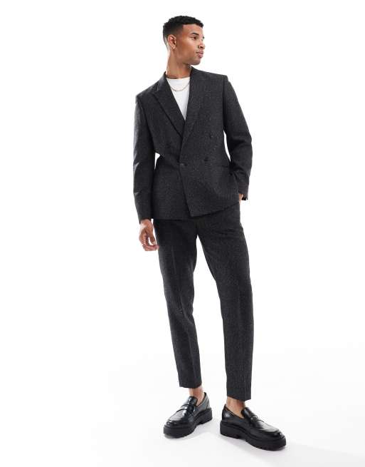 ASOS DESIGN – Svart, fiskbensmönstrad, dubbelknäppt kostym med smal passform