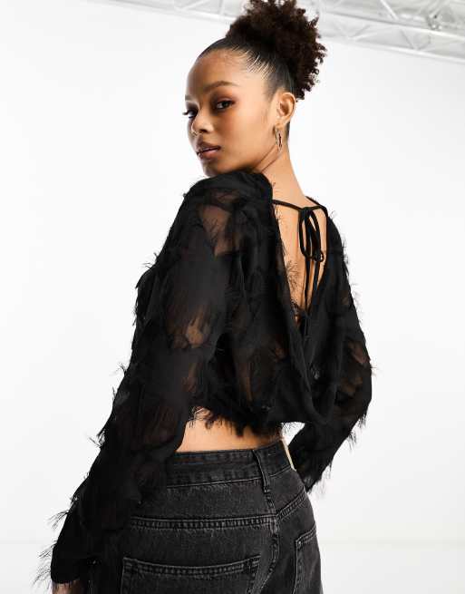 ASOS DESIGN – Svart, fluffig topp med drapering baktill och jacquardvävda stjärnor
