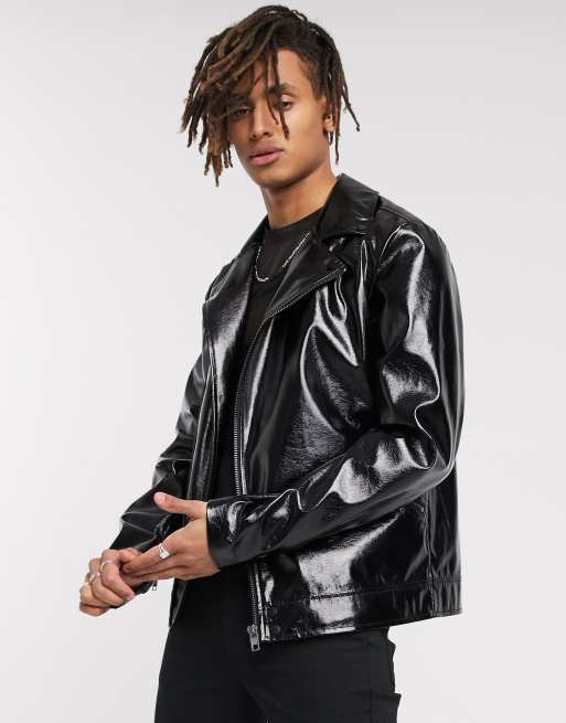 ASOS DESIGN – Svart, glansig bikerjacka i läderimitation