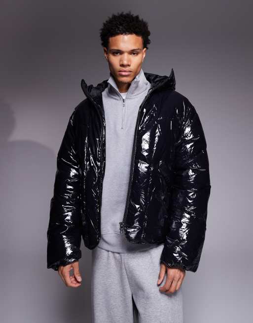 ASOS DESIGN – Svart, glansig pufferjacka i oversize