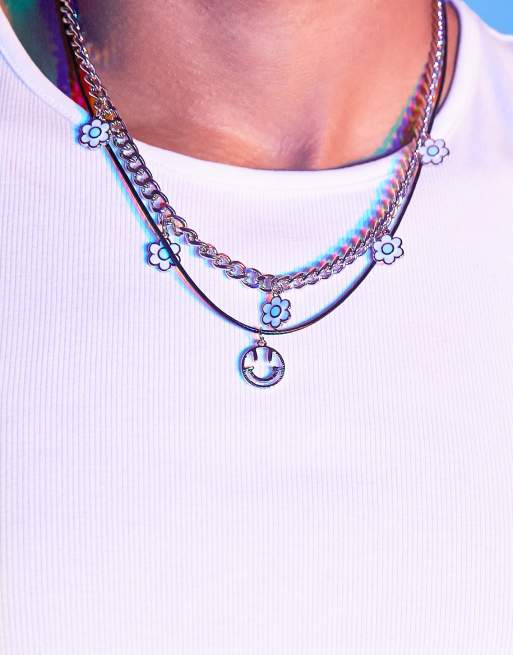 ASOS DESIGN – Svart halsband med emaljblommor och ett silverfärgat smiley-hänge, 2-pack