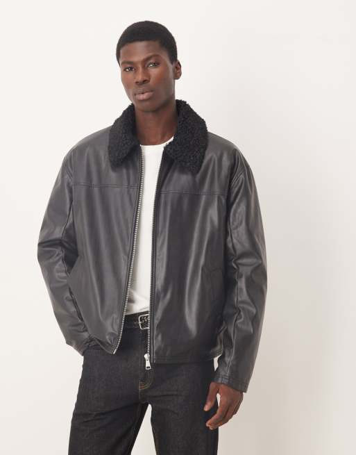 ASOS DESIGN – Svart Harrington-jacka i läderimitation med manchesterkrage