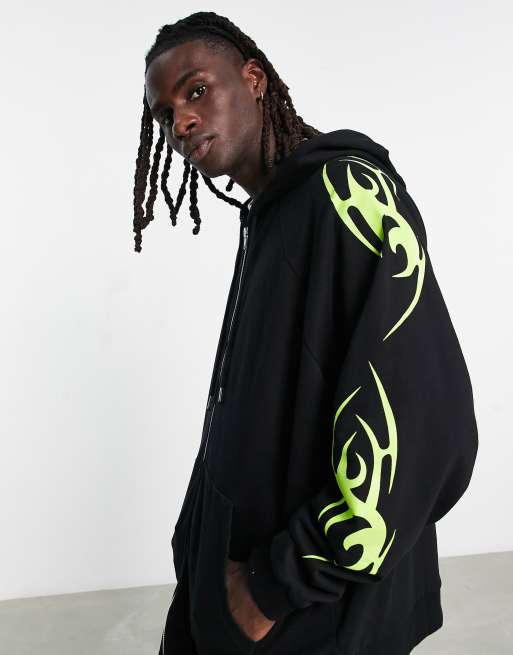 ASOS DESIGN – Svart hoodie i extra oversize med dragkedja och tatueringstryck i neon