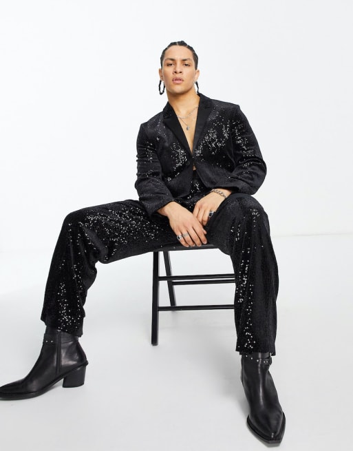 ASOS DESIGN – Svart kostym med extrema slag och paljetter