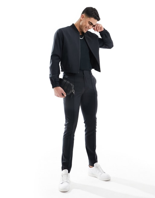 ASOS DESIGN – Svart, kritstrecksrandigt fint set med bomberjacka