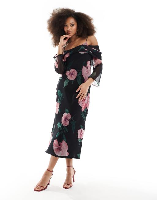 ASOS DESIGN – Svart, långärmad midiklänning med bardotringning och blommigt mönster