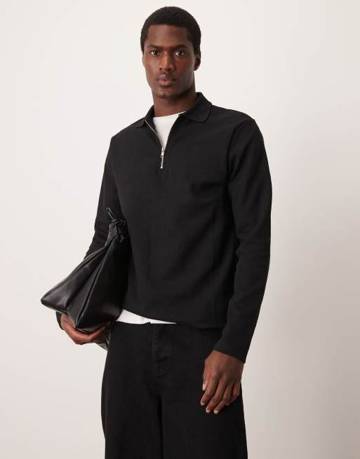 ASOS DESIGN – Svart, långärmad pikétröja med våfflad struktur