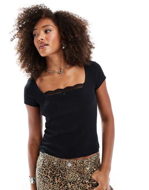 ASOS DESIGN – Svart, liten t-shirt med två lager, spets och rosett