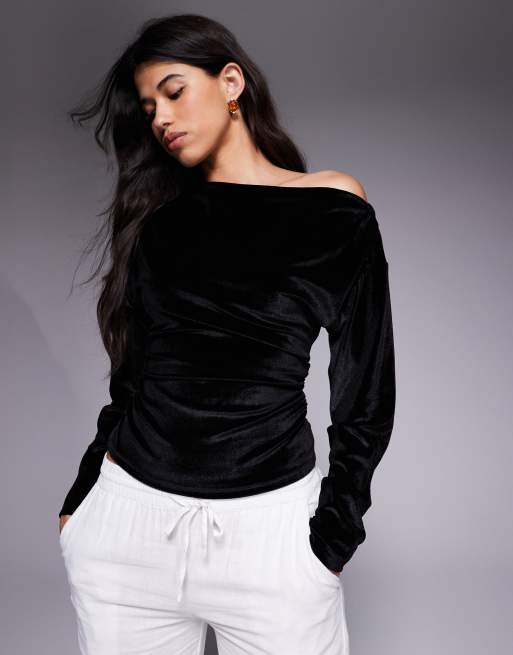 ASOS DESIGN – Svart manchestertopp med bara axlar och rynkning i sammet