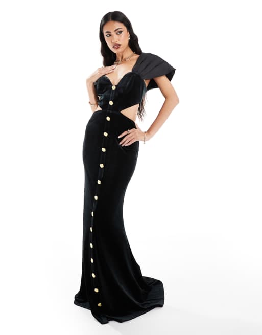 ASOS DESIGN – Svart maxiklänning i sammet med guldfärgade knappar och kontrasterande satinärmar