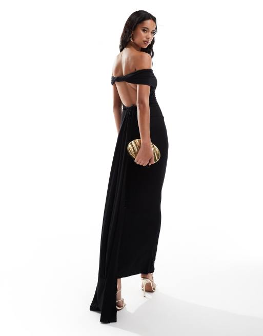 ASOS DESIGN – Svart maxiklänning med bardotringning, bar rygg och släpdetalj baktill