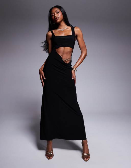 ASOS DESIGN – Svart maxiklänning med fyrkantig halsringning, 90-talskedja i midjan och djupa, utskurna detaljer