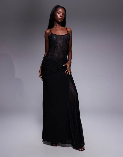 ASOS DESIGN – Svart maxiklänning med korsettliv och vid, panelsydd kjol i spets