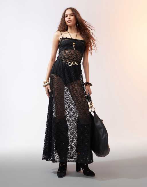 ASOS DESIGN – Svart maxiklänning med spets, volang, skärp och smala axelband