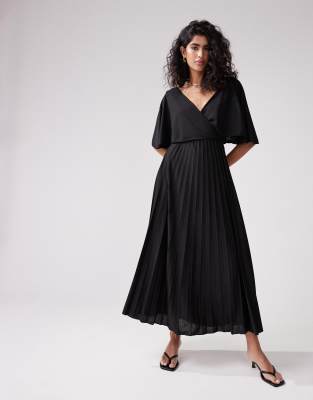 ASOS DESIGN – Svart midiklänning i omlottdesign med utsvängda ärmar och plisserad kjol