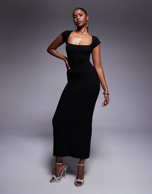 ASOS DESIGN – Svart midiklänning med djup halsringning, holkärmar och detalj under bysten