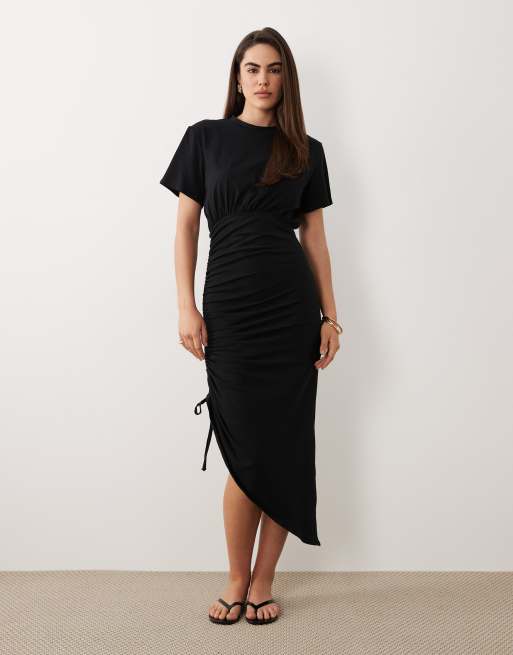 ASOS DESIGN – Svart midiklänning med korta ärmar och ryschad knytning i sidan